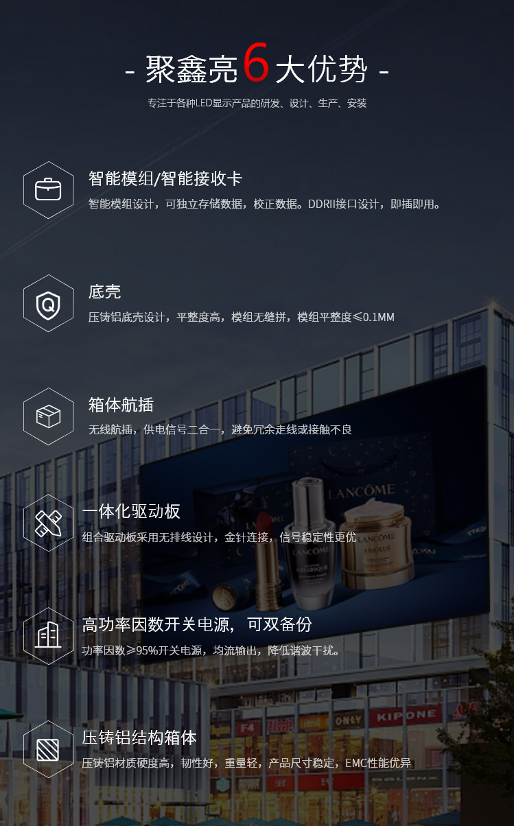 廣東省聚鑫亮顯示技術股份有限公司是一家專注于終端顯示設備研發、生產、銷售、施工和服務于一體的專業照明顯示屏公司。公司注冊資金二千萬,參與國家大型重點工程的照明顯示屏建設。公司以強大的科研實力,不斷拓展新品。目前產品包括:LED全彩室內外高清顯示屏、LED異形屏、LED透明屏、LED開合移動旋轉屏、戶...